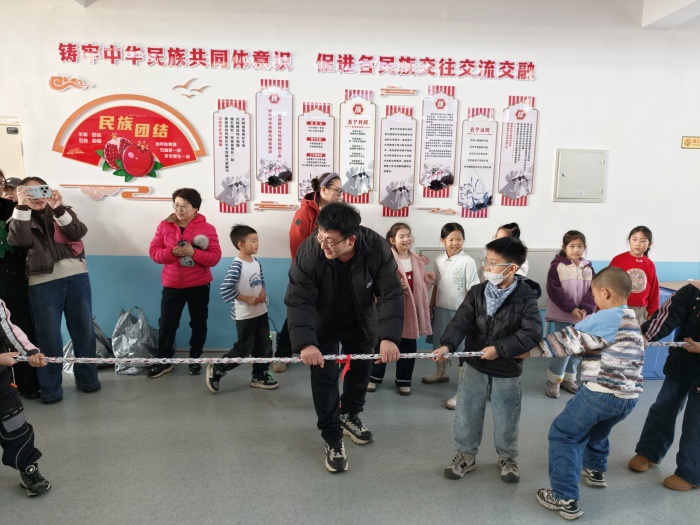 在游戏互动环节,科技辅导员与宣讲员组织各族青少年开展拔河比赛,通过亲身体验帮助孩子们理解“中华民族一家亲,同心共筑中国梦”的深刻内涵。比赛中,孩子们紧握绳索、齐心协力,为团队胜利全力以赴。赛后,科技辅导员与宣讲员趁热打铁,引导大家思考:“为什么拔河比赛能取得胜利”“如果在拔河比赛中有一个同学不用力,结果会怎样?”孩子们争先恐后地回答:“需要大家一起用力!”“团结才能胜利!”中华民族作为一个共同体,需要56个民族手足相亲、同心同向,才能凝聚起团结奋斗的磅礴力量。
